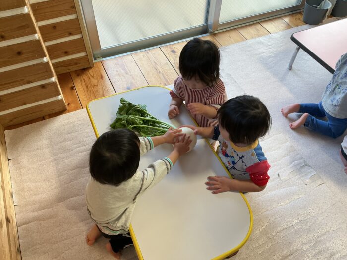 大根の葉を見たり触ったりしてもらってからおやつを食べてもらいました。